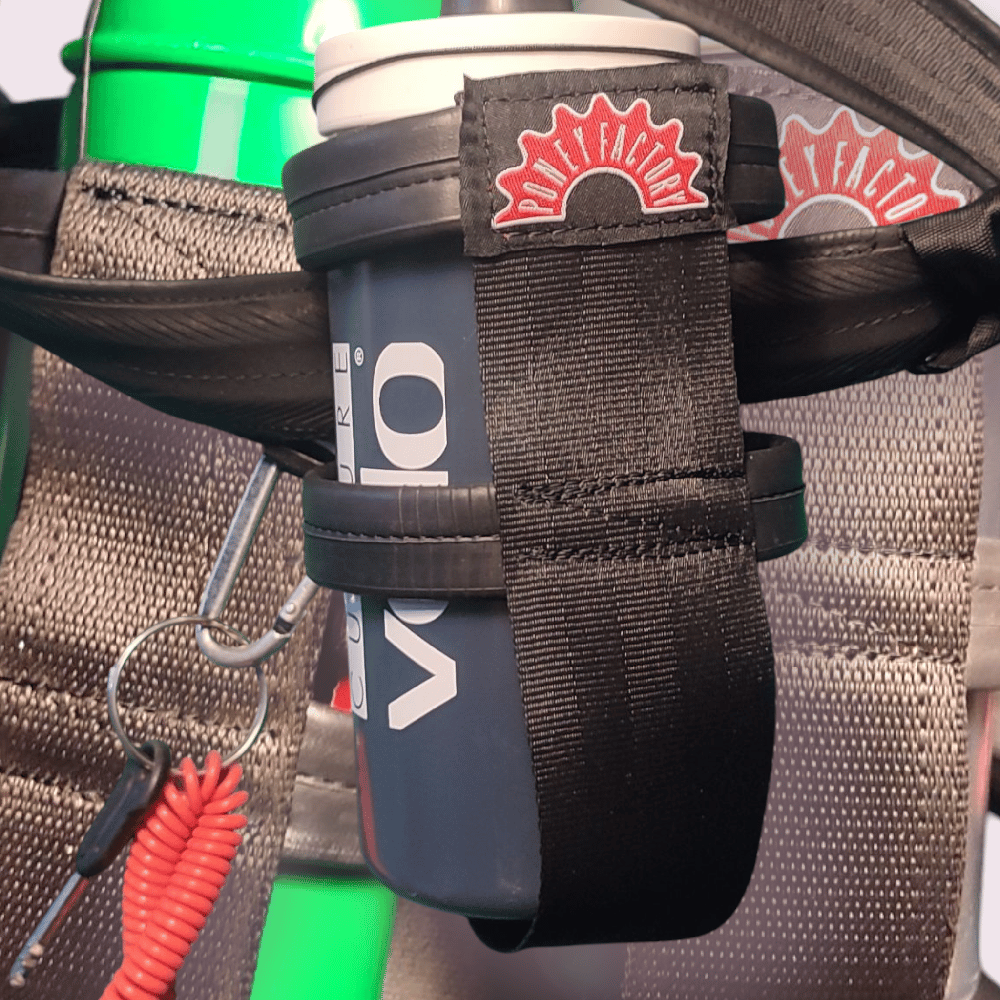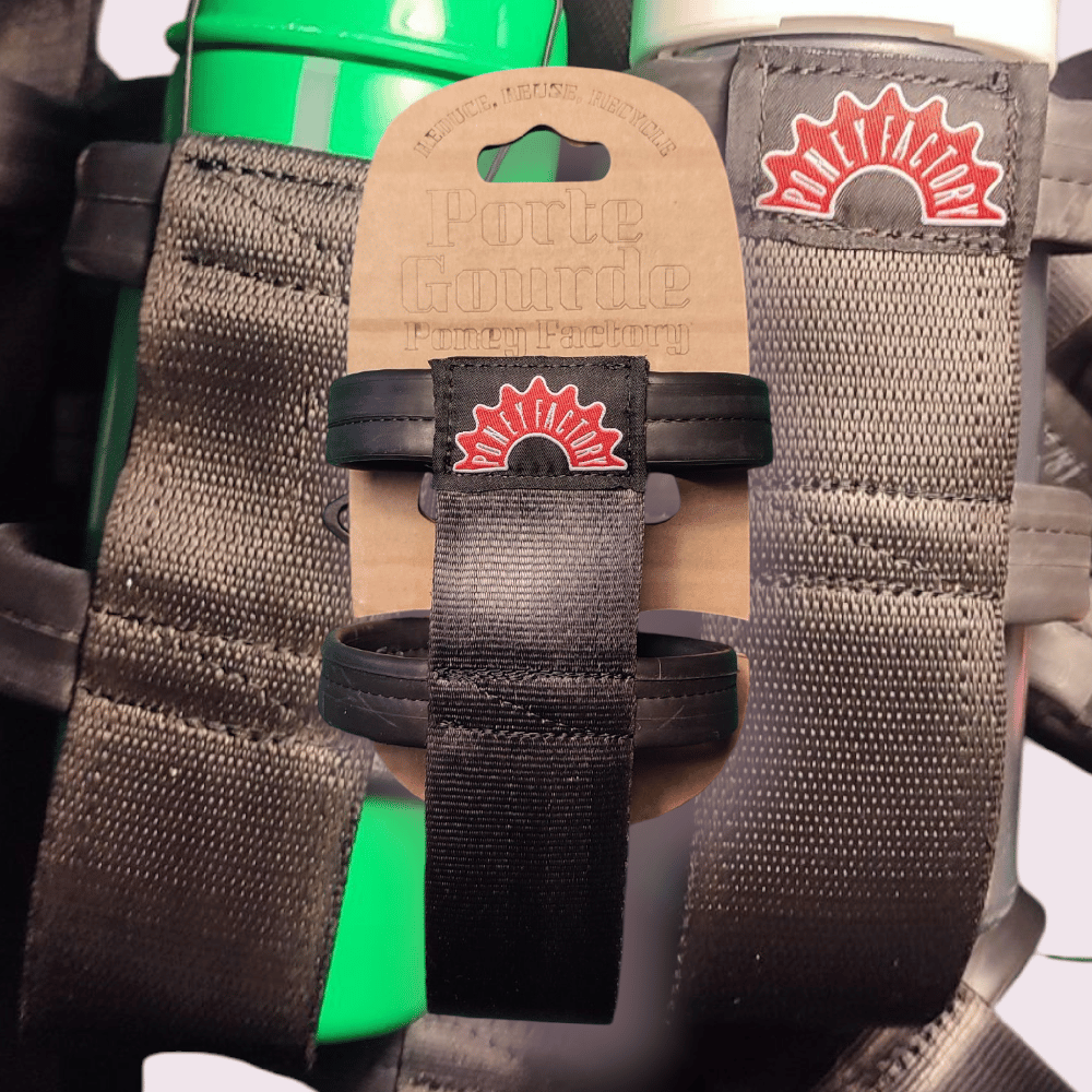 Ce porte bidon souple est upcyclé à 100% grâce à un savant mélange de ceintures issues des casses auto Gersoise et de chambre à air usé par différents riders occitans.